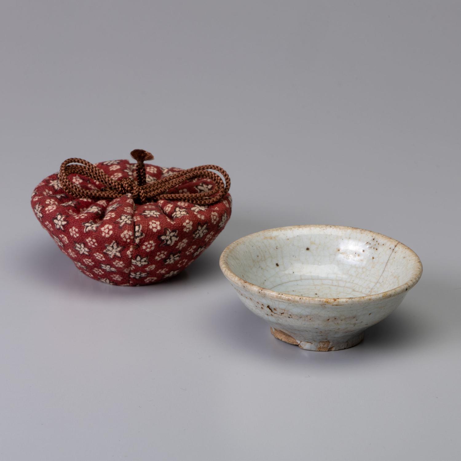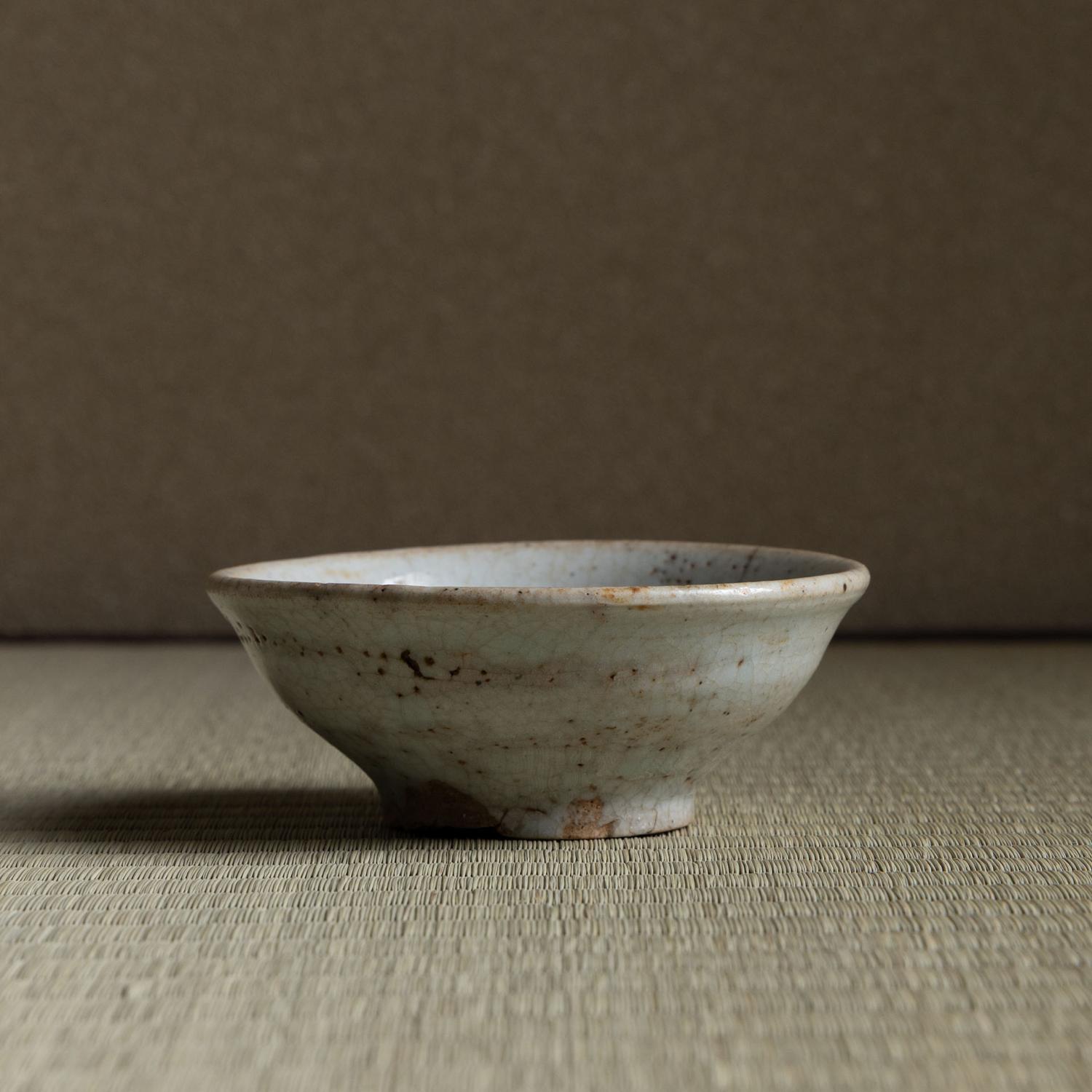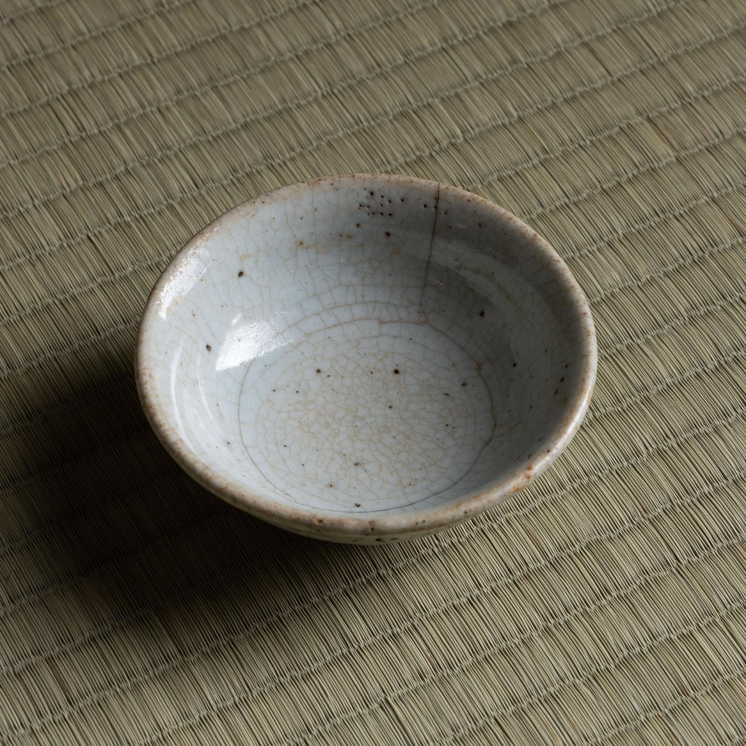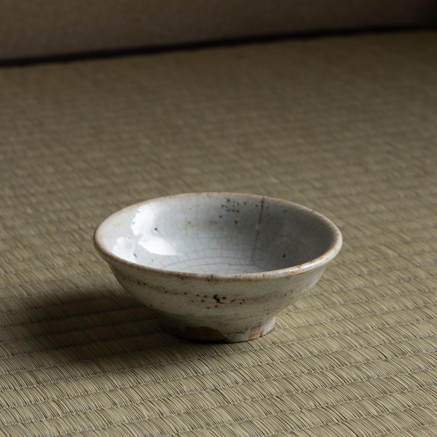 堅手 盃 一献 傾ける度に少しずつ育っていきそうな盃です。 更紗の仕服に入り桜の木で造った曲げの箱に入っています。 高:3.9糎 径:9.8糎