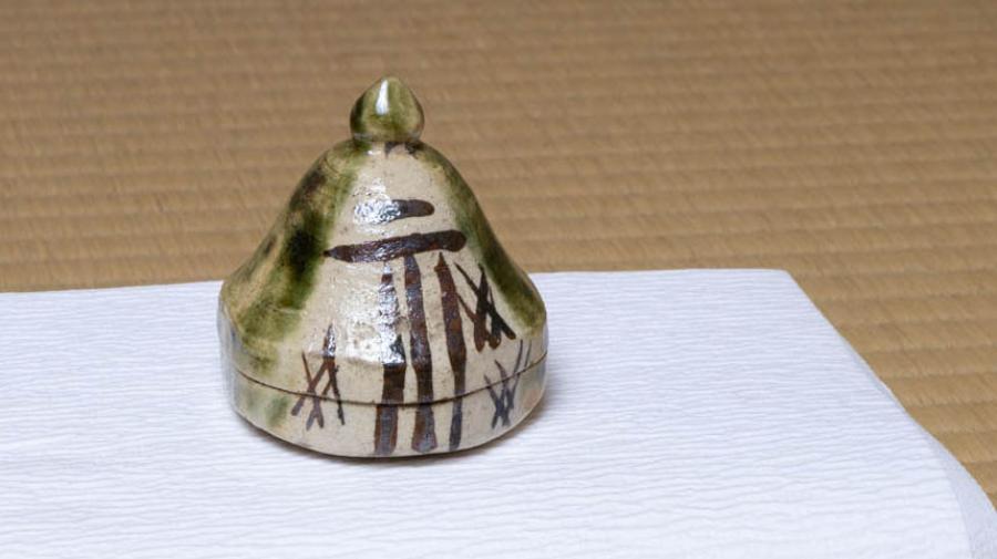 香合は織部の辻堂です。辻堂といえば染付が多く見られますが、本作は織部でございます。染付の屋根形は四角錐であるのに対し、この香合は円錐で、全体に丸味があり、織部らしい抽象的な意匠が見どころです。