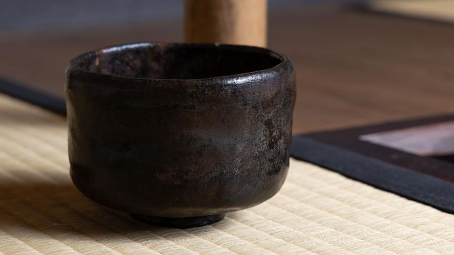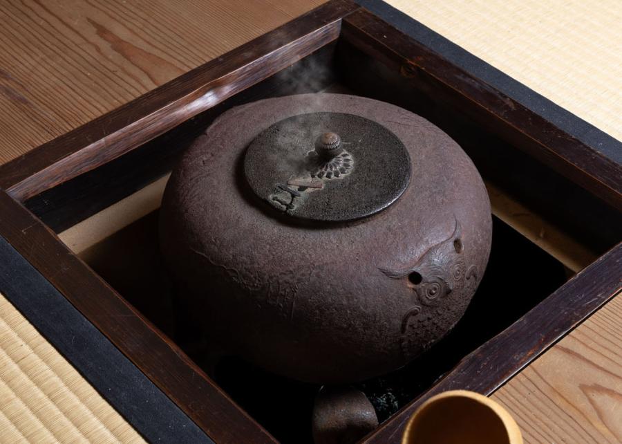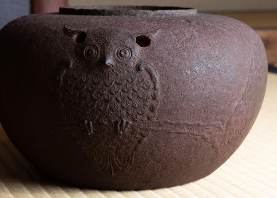 釜は古天明で、鐶付の辺りに可愛らしい「木菟(みみずく)」の文様がございます。木菟は、不苦労(ふくろう)で縁起物、魔除け・厄除けとされます。暮れは新年を迎える支度の時期でもあり、この釜を懸けました。蓋はヤツレで、鎹(かすがい)で直してあります。穴を完全には塞がず、あえて隙間を残すことで、お点前中でも蓋を切らずに使えるように工夫されています。なお、共蓋もあり、そちらは一葉の摘みになっています。