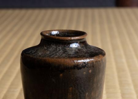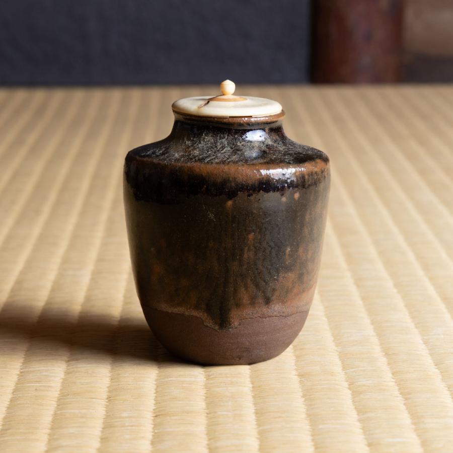 茶入は、瀬戸金華山・生海鼠手(なまこで)肩衝茶入、銘「鶉衣(うずらごろも)」でございます。「鶉衣」は継ぎはぎの衣の意で、箱書にも謙遜の名を付けたとあります。黒褐色の鉄釉が濃淡まだらに掛かり、斑文が鶉の羽模様のように見えることから銘が付いたのでしょう。生海鼠手とも呼ばれる所以です。挽家と箱は、豊臣秀長の筆頭家老・桑山重晴が隷書で「鶉衣」と書いています。重晴は利休に学んだ茶人で、藤堂高虎、小堀遠州の父 小堀新介正次とともに、豊臣から徳川へ仕えた有能な戦国武将の一人です。“継ぎ”はぎの衣になぞらえ、新しい年へ繋ぐ橋渡しの思いも込めました。仕服は笹蔓緞子・小牡丹唐草。重晴は来年(令和8年)のNHK大河ドラマ「豊臣兄弟」でも活躍されるでしょう。