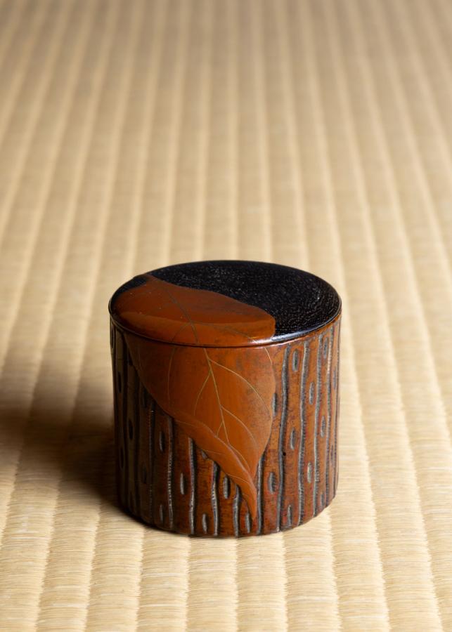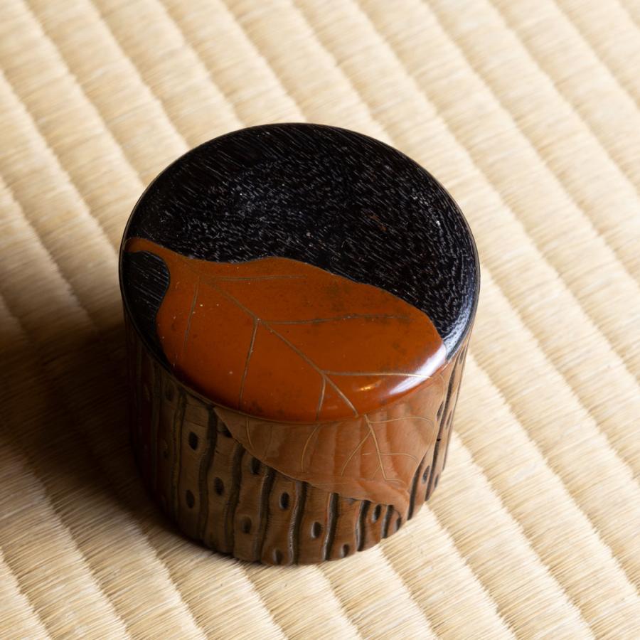 替茶器は、柴田是真作の一葉蒔絵茶器。切り株に、一枚の落ち葉が、蓋から胴にかけて蒔絵されています。