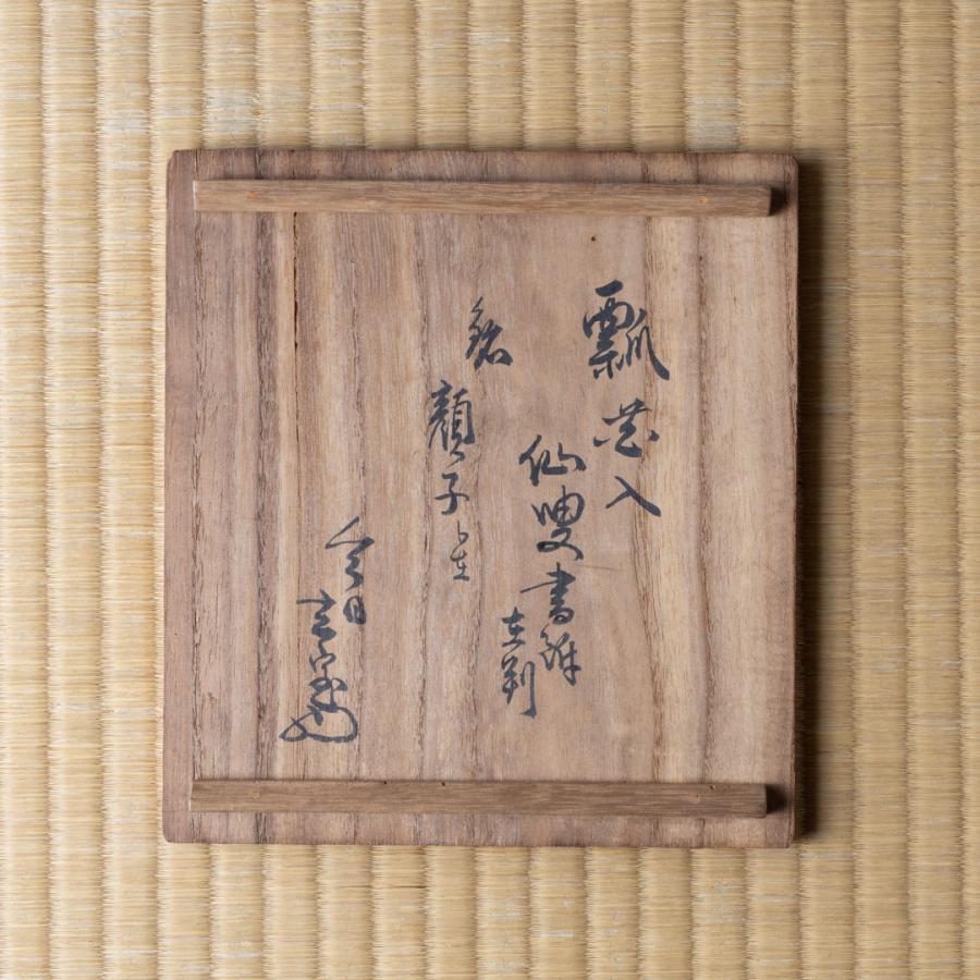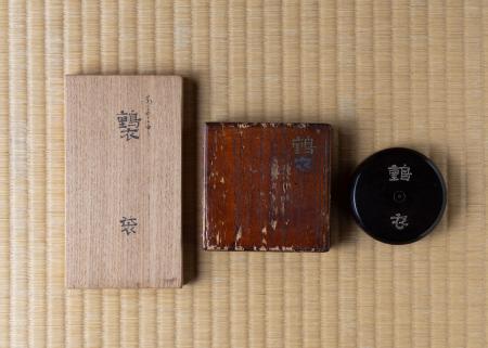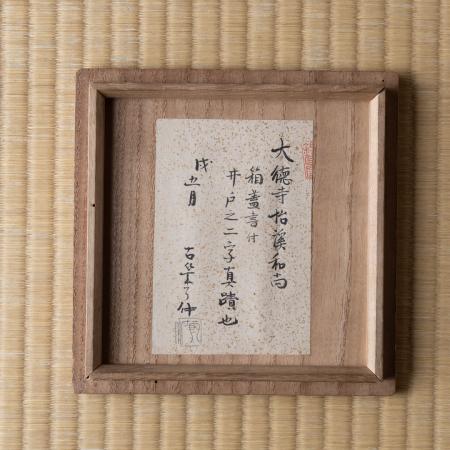 水指は唐銅、箱は宗旦と仙叟の書付です。宗旦が、前田利家の正室「お松」の菩提寺・芳春庵(院)にあった花入を譲り受け、水指に見立て加賀前田家へ茶堂として仕官していた仙叟に持たせたものと思われます。箱には「天和二年(1682)十二月(臘月)」と記載があります。仙叟もまた「臘月庵」の庵号を持ち、臘月に因んだ道具組となっています。