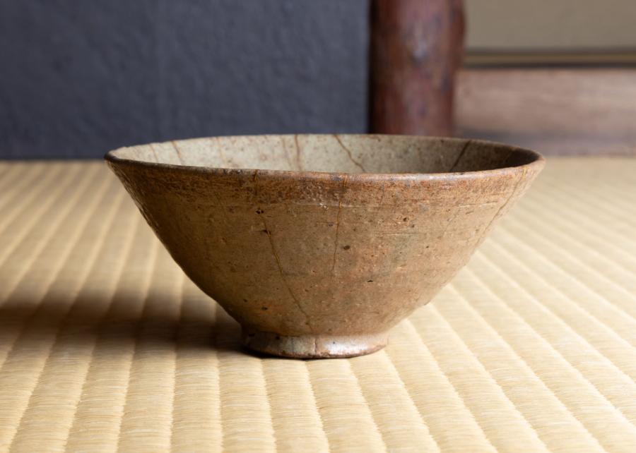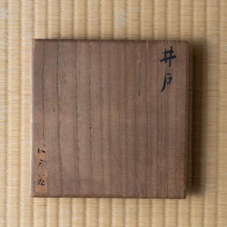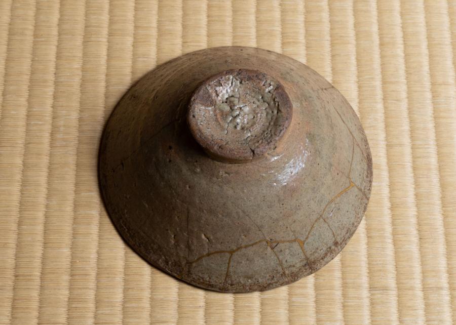 替茶碗は青井戸茶碗。大徳寺253世・怡溪(いけい)和尚の箱で、石州流怡溪派の方でございます。高台が小さく平形で、青味の釉の中にところどころ枇杷色の発色が景色となり、侘びた色調の席中に柔らかな抑揚を添えるものとして選びました。金継があり、これもまた「新しい年へ繋ぐ」意を重ねております。