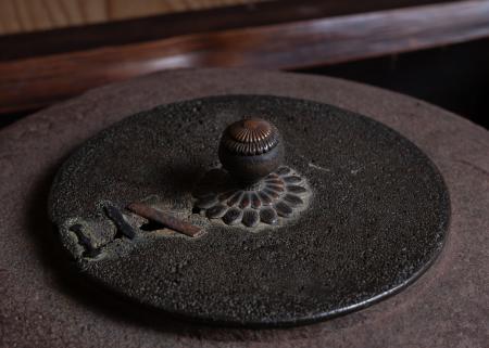 炉縁は大徳寺金毛閣の古材でございます。金毛閣は大徳寺の山門の二階部分に、利休が増築して名付けたものとして知られます。利休居士像を安置したことが秀吉の怒りを招き、利休自決の一因となったという逸話はよく知られております。
